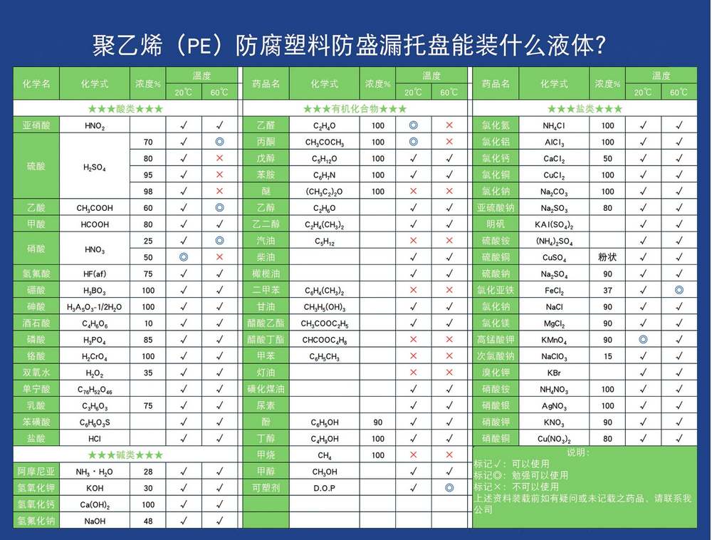 防泄漏托盤是使用純原料聚乙烯HDPE注塑而成,原料PE是一種結晶度高,非極性的熱塑性塑料,具有良好的耐高低溫,耐酸堿,耐腐蝕的特性,這種材質常用與制造塑料包裝制品。